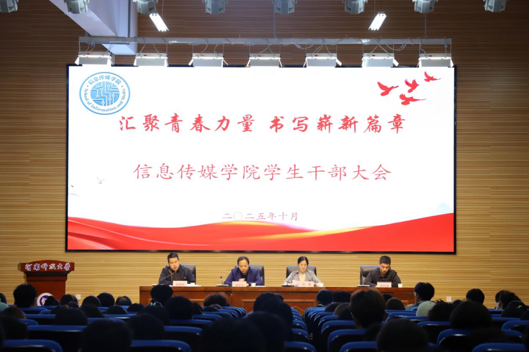 为进一步加强我院学生干部队伍建设,提升学生干部综合素质与工作水平,确保学生工作高效有序开展、服务学生成长成才,10月15日,信息传媒学院召开2025年秋季学期学生干部大会。信息传媒学院党总支书记刘学文、党总支副书记、院长侯枫、党总支副书记、副院长董朝贤、学工办负责人张阿童、全体辅导员出席大会。学院全体学生干部以及入党积极分子参加了会议,会议由董朝贤主持。