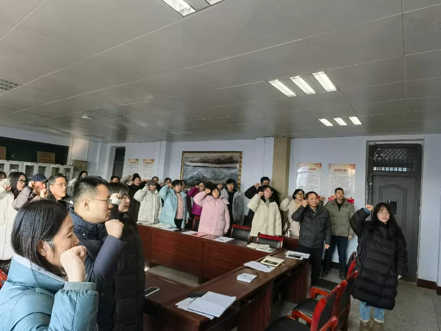 会议严格落实“第一议题”制度。首先,教工第二党支部书记薛龙领学习近平总书记在中央城市工作会议上的讲话精神,党员代表王钧玉结合学习内容发言,强调高校教育工作者要立足自身岗位,将服务城市高质量发展作为重要使命,实现个人价值与社会价值的统一。随后,夏璞同志领学《推进党的作风建设常态化长效化》文件精神,推动党员不断加强廉洁文化建设,传承优良家风。接下来由郭立业同志领学习近平总书记在二十届中央纪委五次全会上的重要讲话精神,强化全面从严治党责任意识;专职组织员上官丽婉宣读《关于开展2025年度基层党建工作考核通知》要求,明确1月31日前需全面完善考核指标并上传至“砚池党建云”平台。