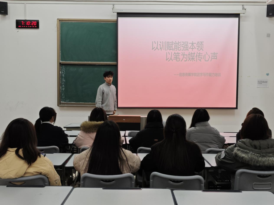 为夯实学院宣传工作根基,提升学生干部写作与新闻创作能力,更好地适应校园活动宣传、日常办公等工作需求。12月5日,信息传媒学院面向团总支秘书处、宣传部及全院学生干部开展写作能力专项培训。本次培训聚焦实用写作技巧,干货满满,有效破解了学生干部在写作中遇到的难点痛点问题。