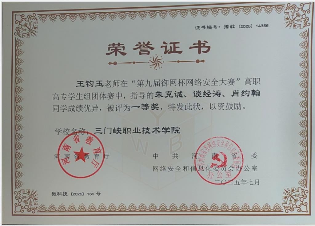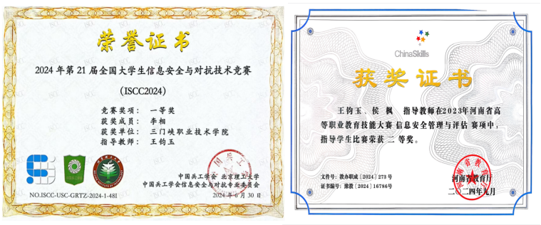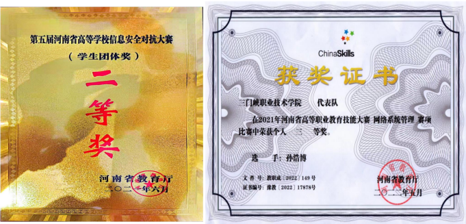 竞赛支撑:2021年至今,学生获全国职业院校技能大赛、全国信息安全对抗大赛、河南省“御网杯”网络安全大赛一等奖共计3次,二等奖多次。