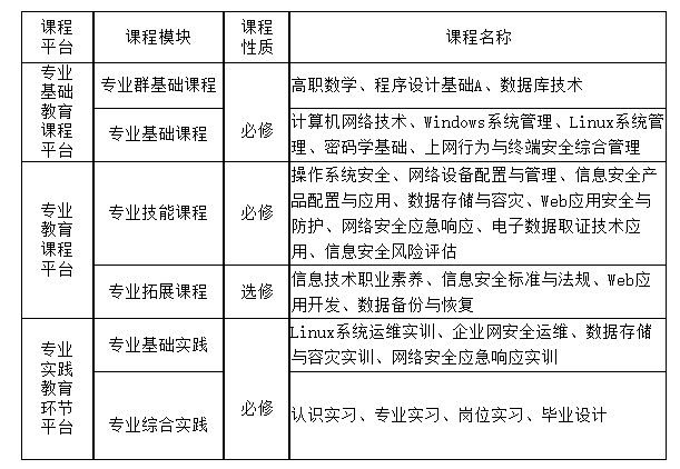 本专业培养能够践行社会主义核心价值观,传承技能文明,德智体美劳全面发展,具有一定的科学文化水平,良好的人文素养、科学素养、数字素养、职业道德、创新意识,爱岗敬业的职业精神和精益求精的工匠精神,较强的就业创业能力和可持续发展的能力,掌握本专业知识和技术技能,具备职业综合素质和行动能力,立足豫晋陕等中部城市社会经济发展的总体要求,面向网络安全运维、信息安全产品技术支持、数据安全与恢复、系统安全运维等岗位,能够从事网络安全管理与运维、信息安全产品的部署、维护和售后服务、数据的安全保护和恢复、系统安全运维等工作的高技能人才。
